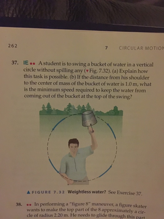 A student is to swing a bucket of water in a vertical circle without spilling any fig. A bucket of water is whirled around in a vertical circle with radius 1m. Look at the fbd for the bucket at the top of the whirl.